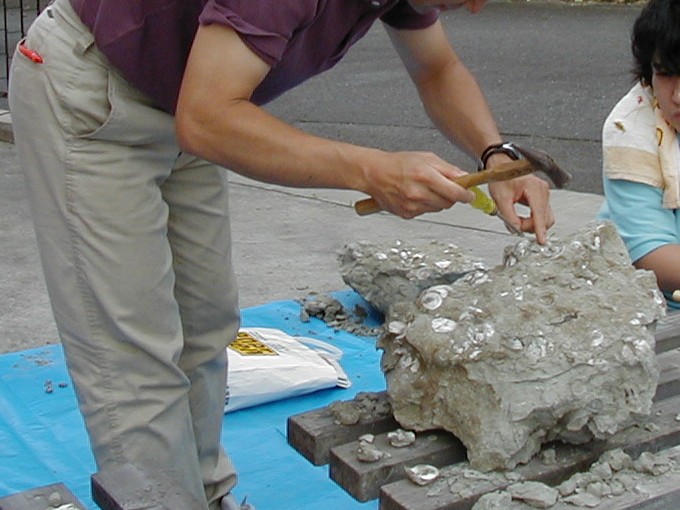 貝の化石がたくさん見つかりました。岩のかたまりを持って帰って、中の化石をとりだします。これをクリーニングといいます。