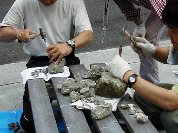 タガネとハンマーで少しずつ回りの石をけずりとっていきます。