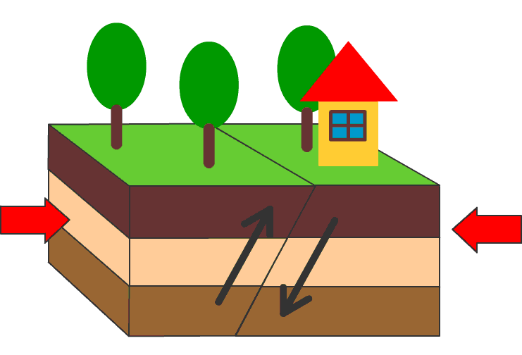 地面に左右から押し付けるように力が加わって、片側(上盤…下の図では左側)が、もう片側(下盤…下の図では右側)に乗り上がるようにずれるタイプの断層を逆断層と呼びます。