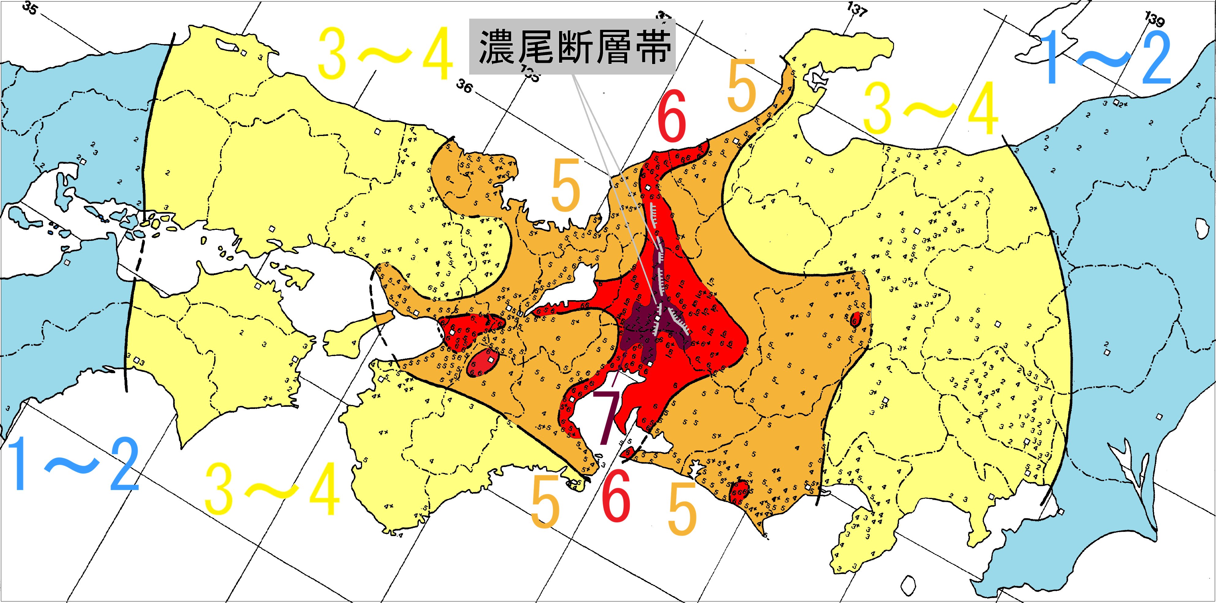 濃尾地震の震度分布(地震直後のアンケート調査より)