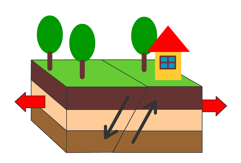 地面を左右から引っぱるように力が加わって、片側(上盤…下の図では左側)が、もう片側(下盤…下の図では右側)をずり下がるようにずれるタイプの断層を正断層と呼びます。