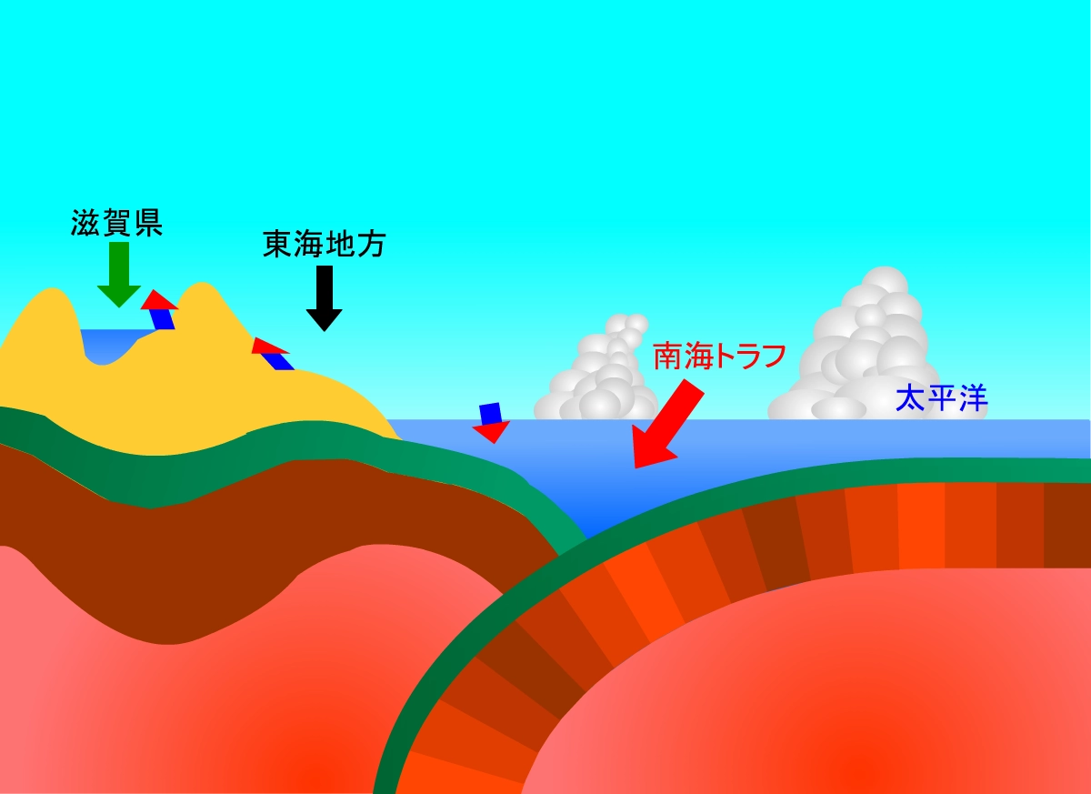 日本列島の東や南の海底では、海のプレートが、陸のプレートの下にもぐりこんでいます。このしずみこみでできた海底の谷のような地形をトラフとか海溝とよんでいます。西日本の南には、南海トラフとよばれる谷があります。海のプレートは、1年に数センチ~10センチの速さで動き、陸のプレートのはしを引きずりこみながら下へもぐりこんでいます。このとき陸には、ちょうど弓を引くように力がたまっていきます。力がたまりきってこれ以上たえられなくなったときに、一気にはねかえって地震をひきおこします。このとき津波が発生することがあります。