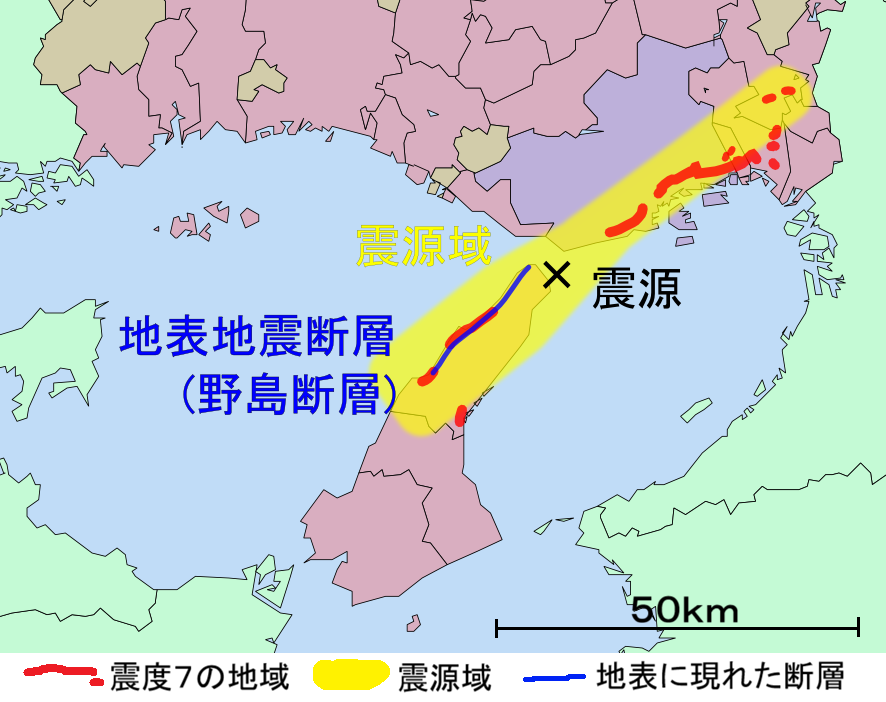 この地震は、野島断層(淡路島側)、六甲断層系(神戸側)の断層の活動によって発生した直下型地震です。淡路、神戸、芦屋、西宮、宝塚などで、最大震度7を記録しました。この震度7は、気象庁の震度階級に震度7が導入されて初めての記録となりました。