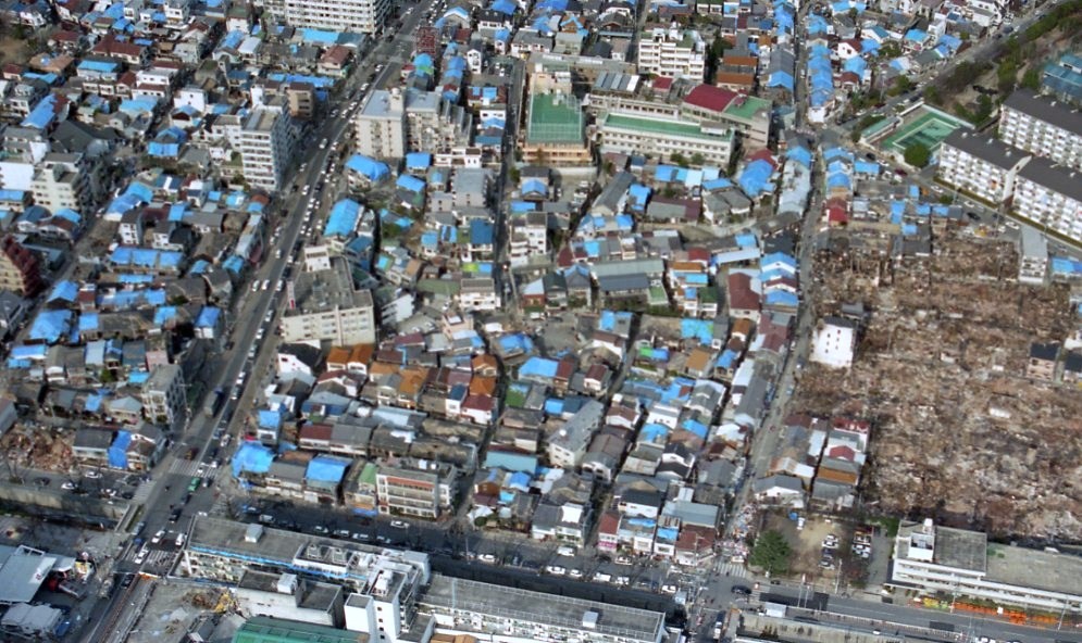 こわれた屋根にブルーシートをかけた住宅(神戸市兵庫区湊川町)1995/1/28撮影