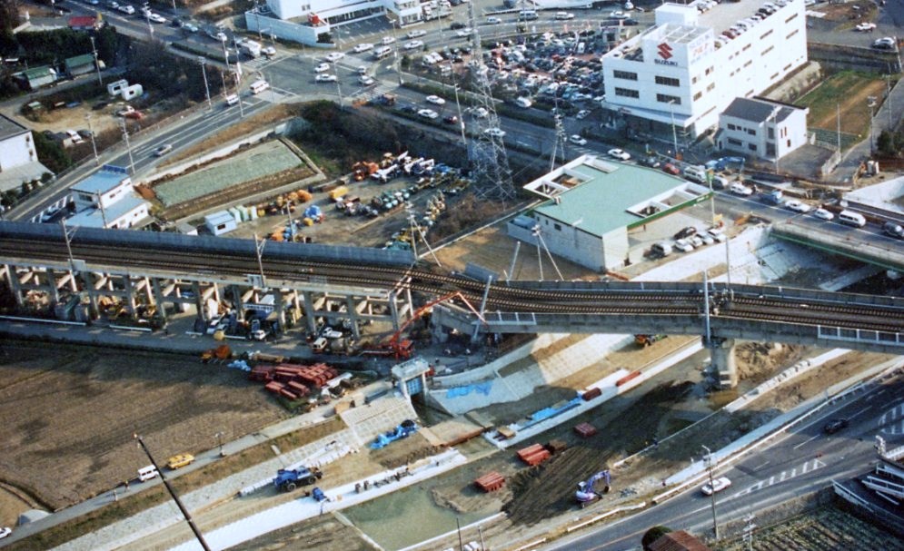 くずれた山陽新幹線の高架橋(こうかきょう)(神戸市西区伊川谷町別府)1995/1/27撮影