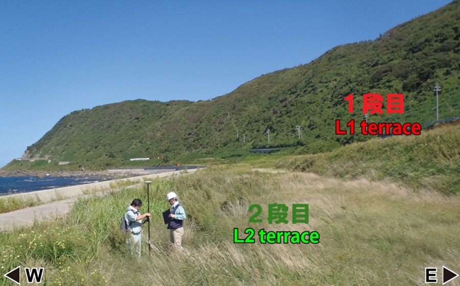 能登半島には、少なくとも3段の海成段丘が確認できます。過去6千年以内に海岸が大きく隆起(りゅうき)する地震が数千年の間かくで少なくとも3回起きたと考えられています。右下の写真では、3段目の段丘は見えていませんが、2024年の能登半島地震によって、さらに4段目の段丘ができました。