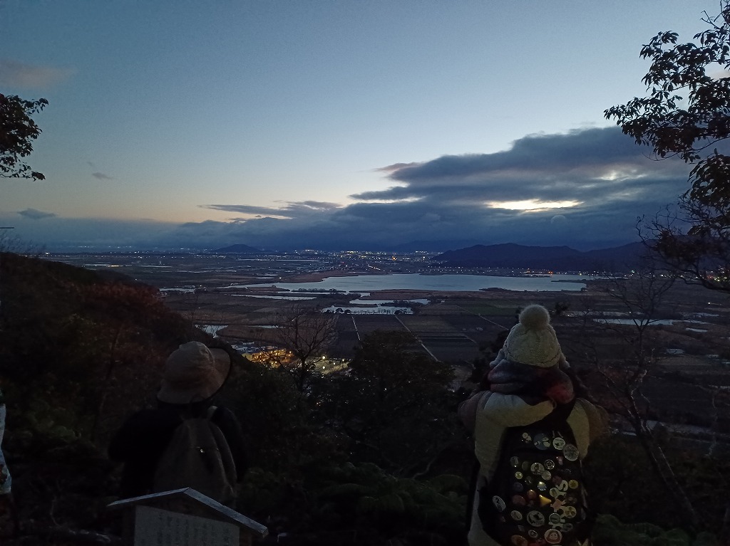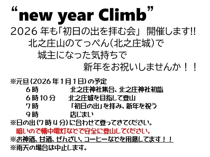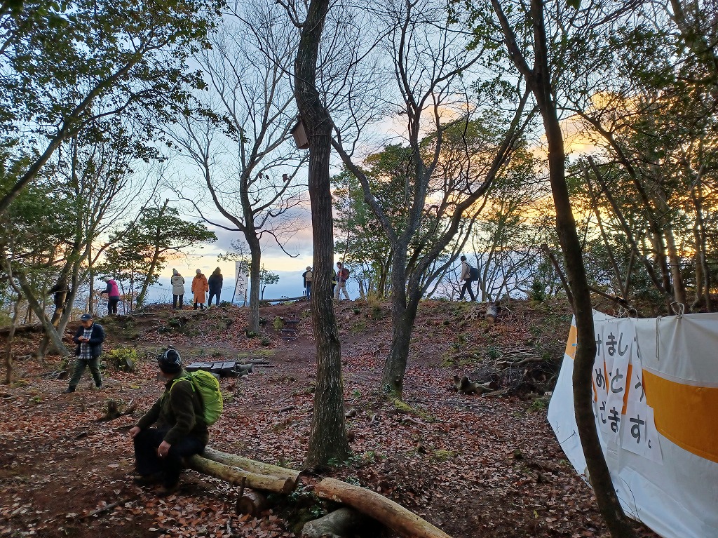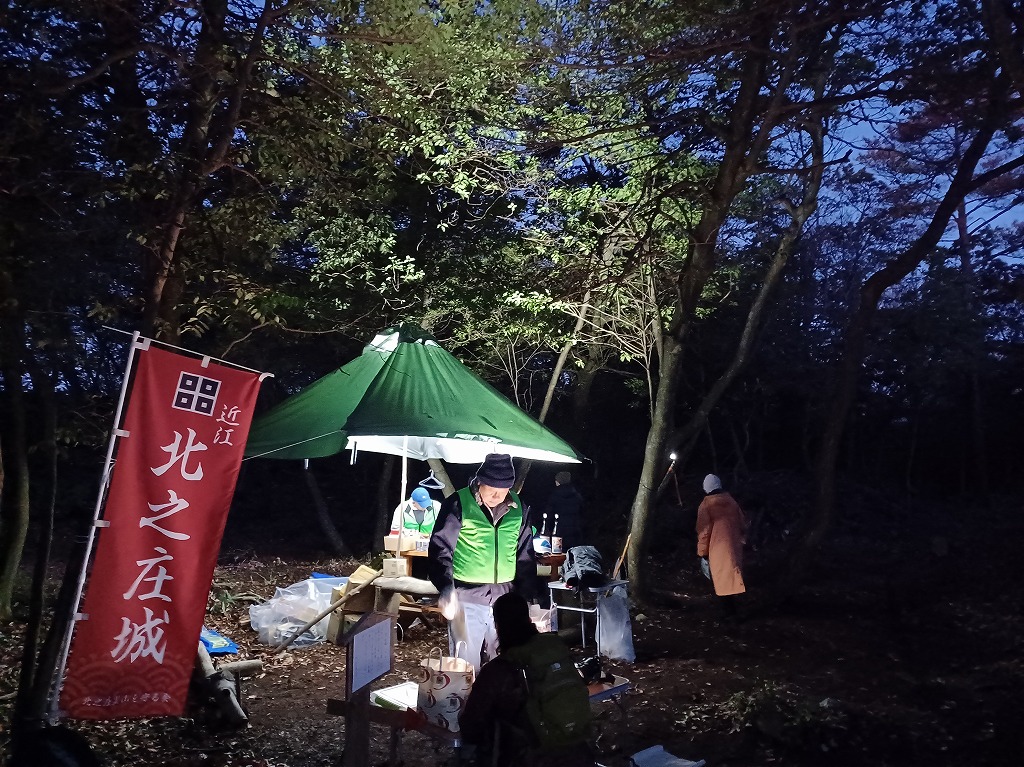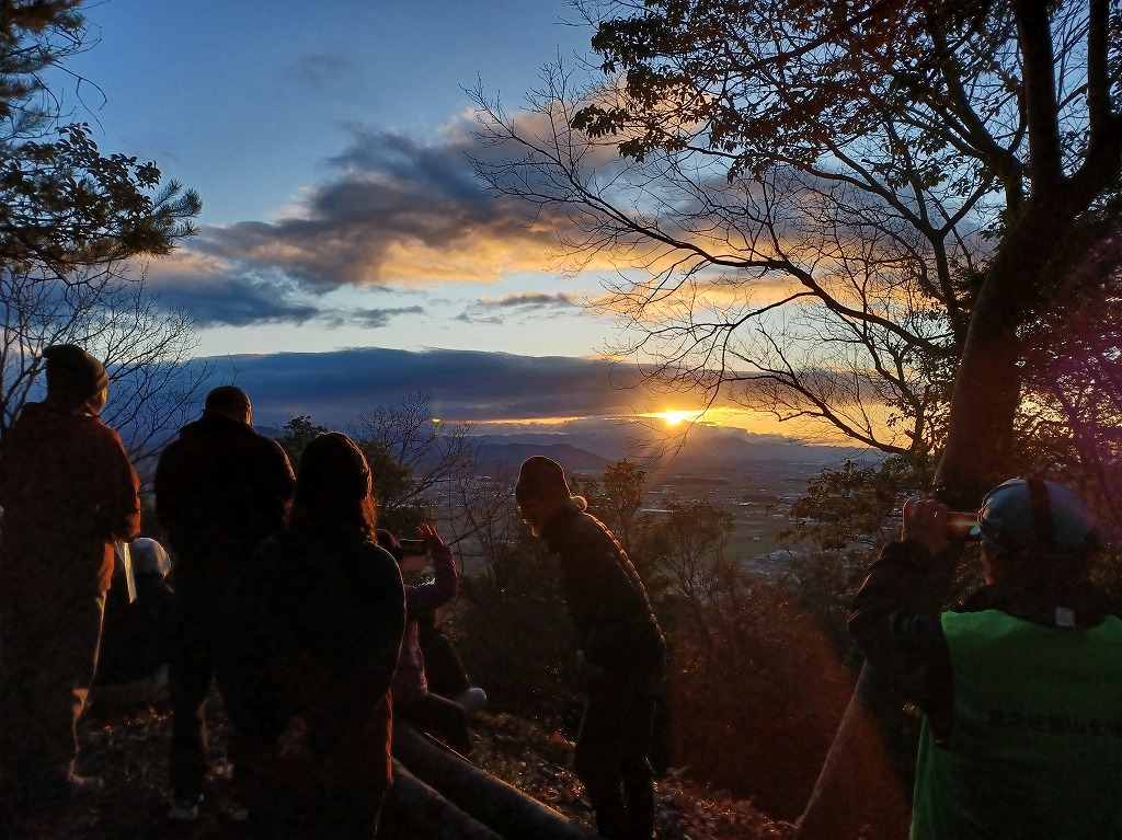 6時に北之庄神社に集合して初詣を済ませてから暗い中を北之庄山に登りました。上段曲輪内で温かいぜんざいを食べたり、お神酒をいただいたりしながら南土塁上で日の出を待ちました。